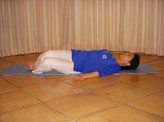 膝を最後まで倒し、その姿勢から、上にある足の膝に下の膝を寄せて両膝で内側へ引締める。肛門を締める。