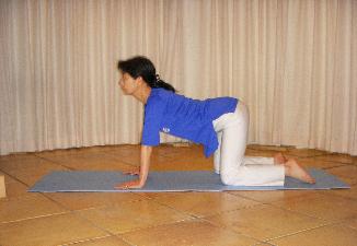 | @四つんばいの姿勢になる。足と手の幅を同じに開き肘を曲ばす。A息を吸いながら手のひらで床を押し、背中全体を丸めて上へ持ち上げる。目線は、自分のおなかを見るようにする。息をきながらBの中心を下へ沈めるようにし、肛門を空の方へ向けて背中を反る。ゆっくりと呼吸に合わせて4回程度 反復する。 |