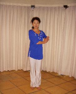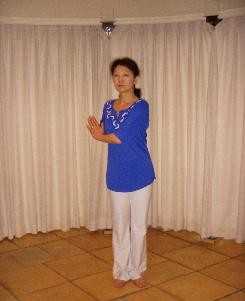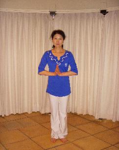 @足を閉じ両手のひらを合わせて、胃の中心の位置に置いた姿勢で立つ。