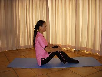@両手(女性は右手、男性は左手を下にして手の重ねる)を丹田に置く。