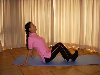 両手を後ろに置き上体を支える。両足を閉じて、内側へ閉める。息を吸い、お尻を力強くしめる。下腹部にも意識をしてしめる。